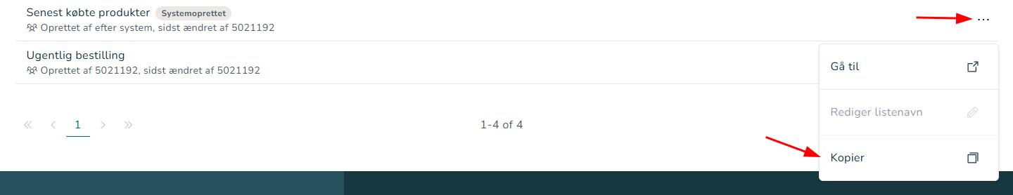 For at gøre det nemt at komme i gang, kan du hurtigt og enkelt kopiere listen med senest købte produkter over i en ny favoritliste. Du kan efterfølgende fjerne de produkter, du ikke ønsker skal fremgå i listen. Du kopierer listen ved at ved at klikke på de 3 små prikker ude i højre side. Herefter skal du klikke på ”Kopier”. Listen er nu kopieret og det kan redigere listenavnet ved at klikke på de tre små prikker ude i højre side på listen.