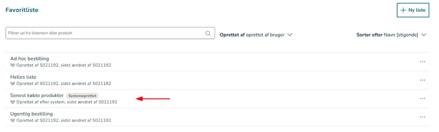 Vi har samlet din gamle favoritlistei én liste – den har vi navngivet ”Senest købte produkter”. Listen viser alle dine tidligere købte produkter samt dine tidligere favoritter. Alle nye produkter du køber fremadrettet, vil automatisk fremgå på denne liste. Listen vil kun vise produkter, som er købt inden for de sidste 24 måneder. Du kan genkende denne liste ved, at den har et mærkat med teksten Systemoprettet, så du tydeligt kan kende forskel på denne liste og dine egne favoritlister.
