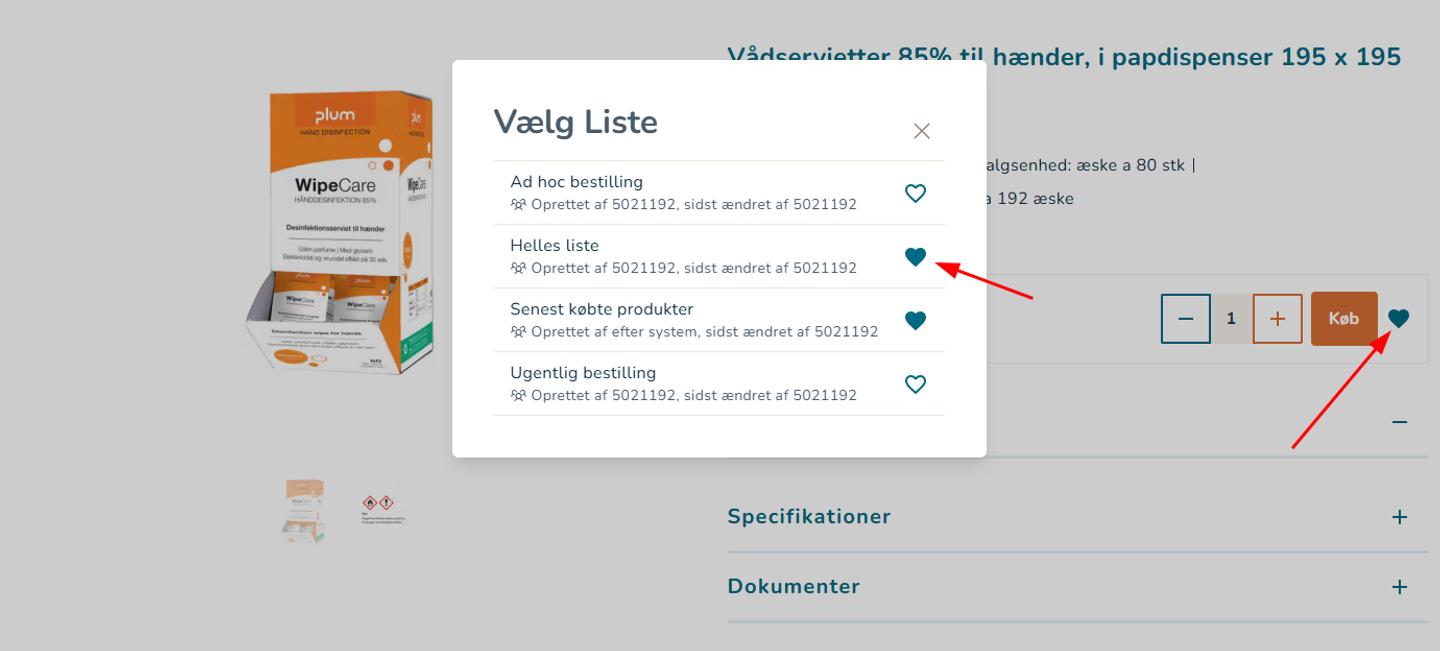 Favoritlisterne er tilknyttet Mediq kontoen. Det vil sige, at alle brugere, som er tilknyttet kontoen, kan tilgå de samme favoritlister. Tilføj nemt nye produkter til en favoritliste ved at klikke på hjerte ikonet på en produkt. Angiv herefter, hvilken liste produktet skal tilføjes til. Ønsker du at fjerne et produkt fra en liste, skal du ligeledes klikke på hjertet, angiv på hvilke lister du ønsker at fjerne produktet, ved at klikke på hjertet, så det ikke længere er udfyldt.