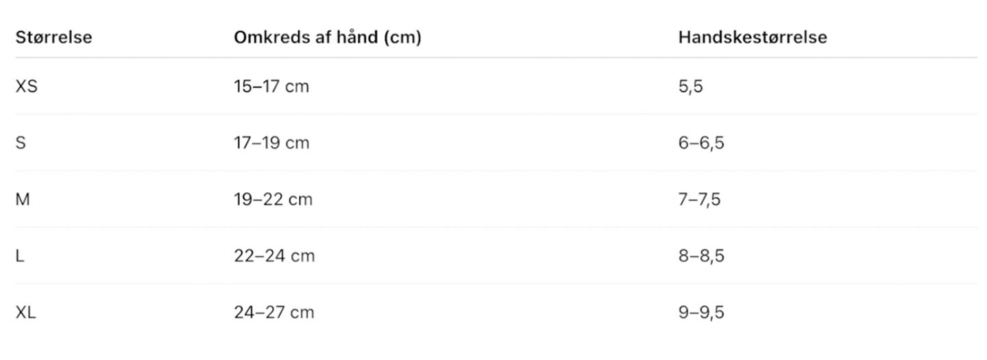 Størrelsesguide for handsker: