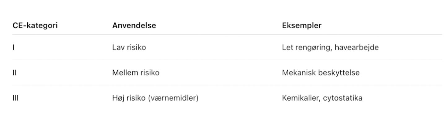 CE-mærkningen viser, hvilken risikokategori handsken tilhører: