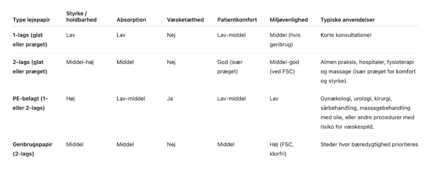 Med mange forskellige varianter på markedet kan det være en udfordring at vælge det mest egnede produkt til den konkrete behandlingssituation. I denne guide får I overblik over de mest almindelige typer af lejepapir, deres egenskaber og anvendelsesområder – så I kan træffe et informeret valg, der matcher både jeres faglige behov og praktiske rammer.